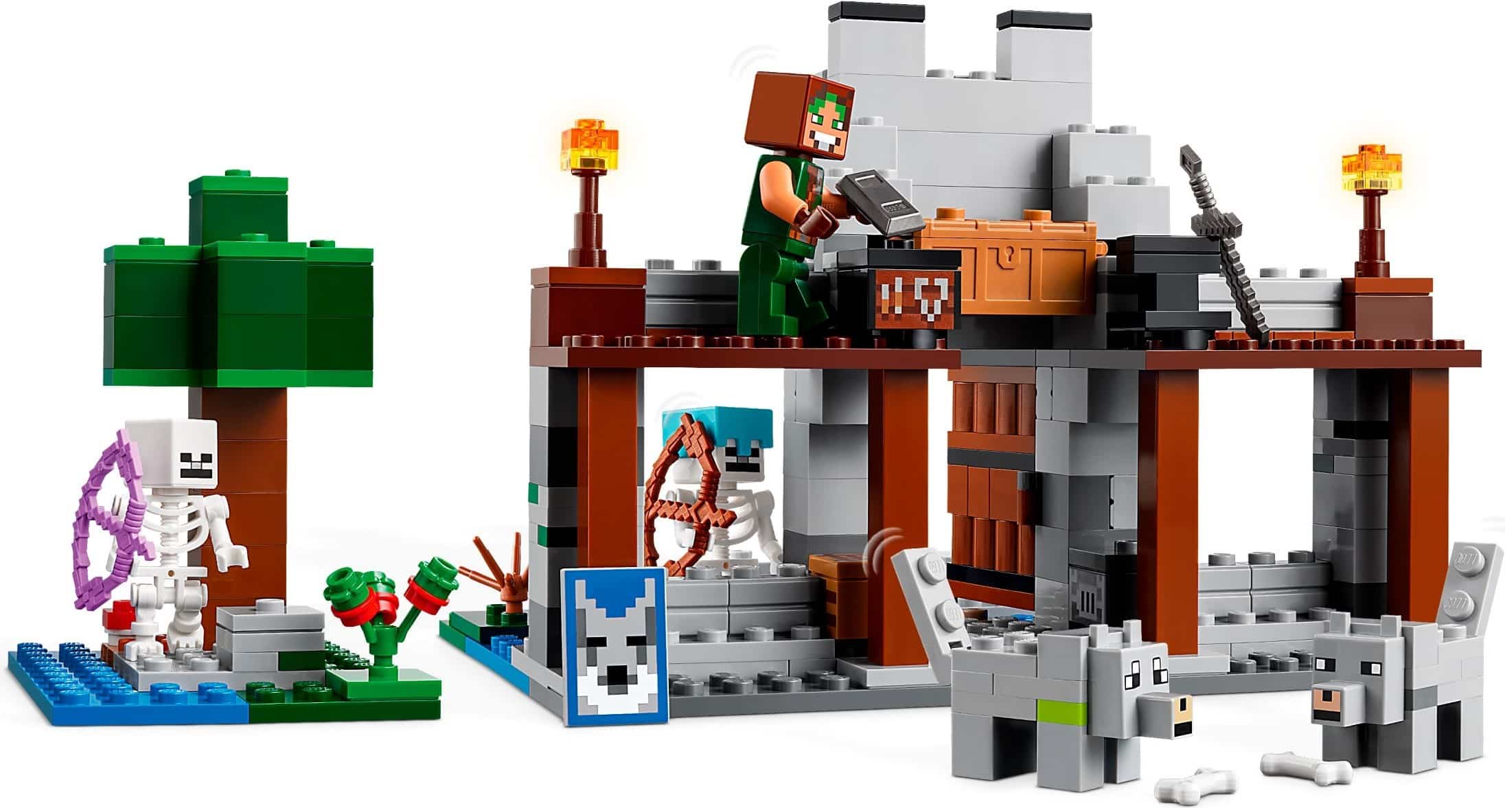 Gear up with supplies like a Netherite ingot, sweet berries, and bones to tame a wild wolf, then defend the stronghold from two skeleton enemies armed with enchanted weapons. With a detailed forest build and fan-favourite characters, this set brings the pixelated world of Minecraft to life in creative new ways.
